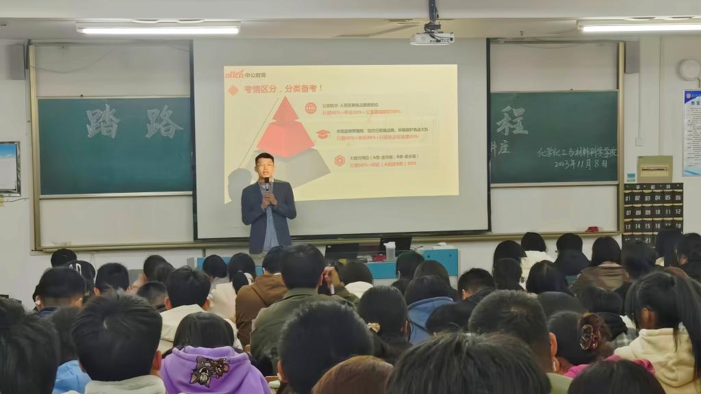 为精准帮助学生就业,提高公务员考试的备考水平和应试技巧,11月8日晚,化学化工与材料科学学院特邀中公教育资深公考指导教师刘老师在综合楼1214教室开展了以“公务员考试规划”为主题的相关专题讲座。