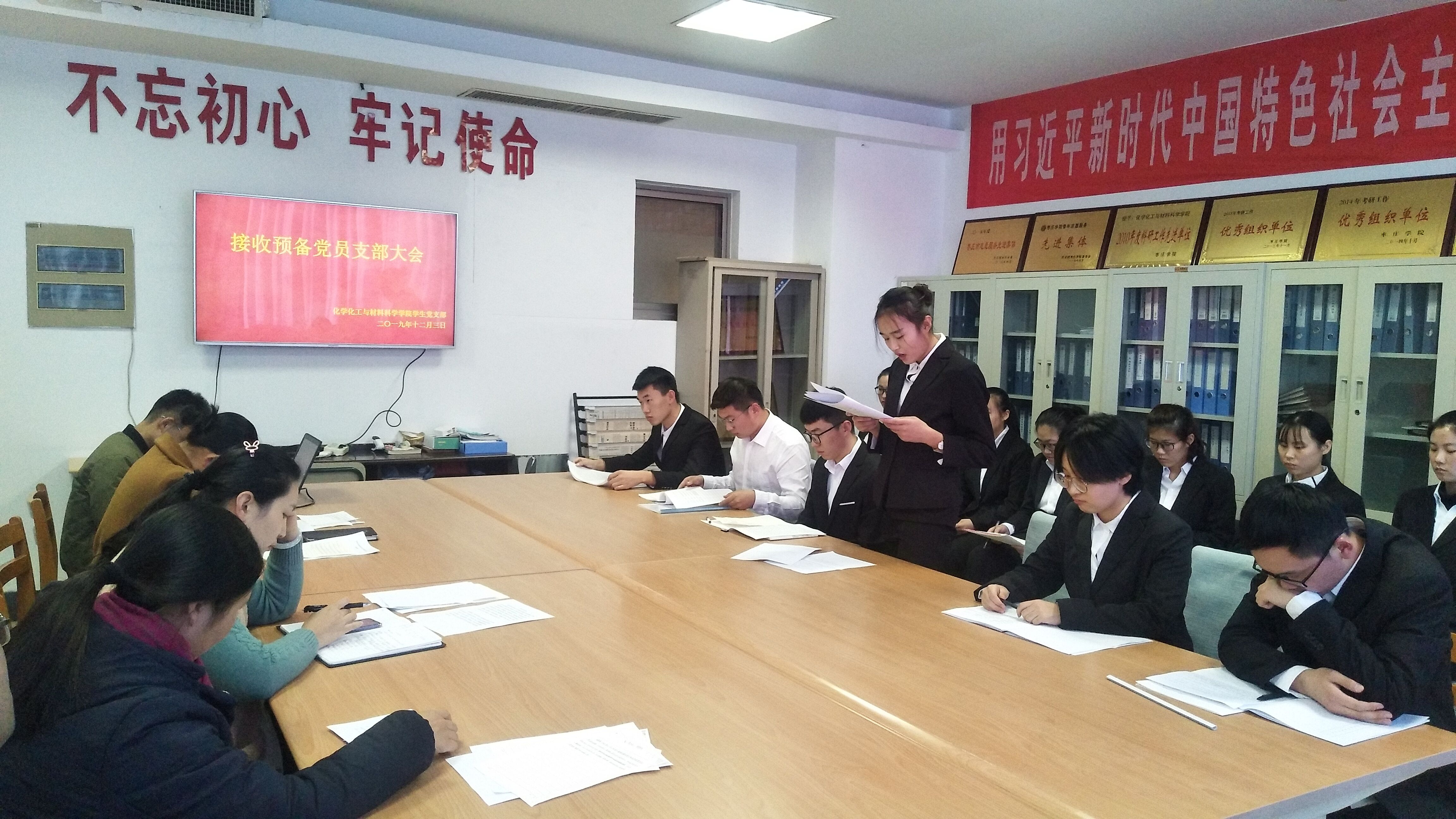2019年12月3日下午,我院学生党支部在综合楼1504会议室召开了接收预备党员支部大会。本次大会议题是讨论是否接戚久超、梁珂、李岩、李忠发、袁浩博、王晓慧、王海萌、刘泽仪、魏健、孙志敏、孔淑文、华正欣、石统华同志为预备党员事宜。会议由支部书记王正荣同志主持,参会有表决权党员共计5人。